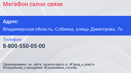 МегаФон, салон связи по адресу Владимирская область, Собинка, улица Димитрова, 7а в дальнейшем Организация, размещена в следующих категориях: