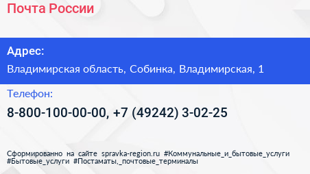 Почта России по адресу Владимирская область, Собинка, Владимирская, 1 в дальнейшем Организация, размещена в следующих категориях: