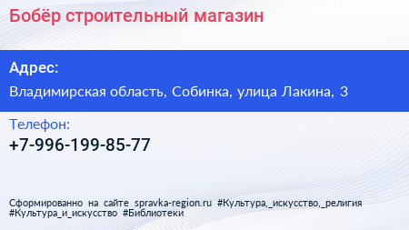 Бобёр, строительный магазин по адресу Владимирская область, Собинка, улица Лакина, 3 в дальнейшем Организация, размещена в следующих категориях: