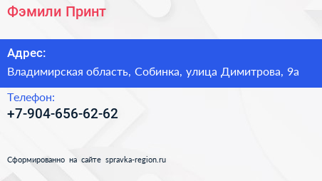Фэмили Принт по адресу Владимирская область, Собинка, улица Димитрова, 9а в дальнейшем Организация, размещена в следующих категориях: