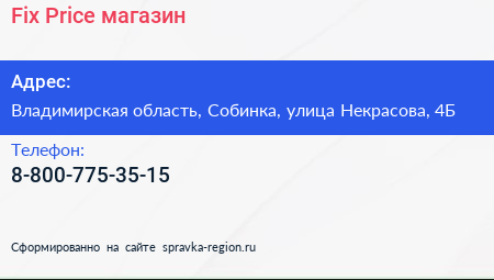 Fix Price, магазин по адресу Владимирская область, Собинка, улица Некрасова, 4Б в дальнейшем Организация, размещена в следующих категориях: