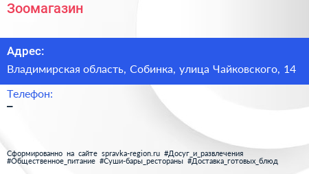 Зоомагазин по адресу Владимирская область, Собинка, улица Чайковского, 14 в дальнейшем Организация, размещена в следующих категориях:
