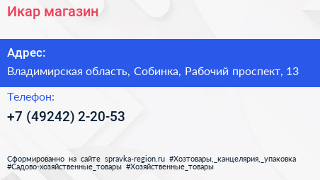 Икар, магазин по адресу Владимирская область, Собинка, Рабочий проспект, 13 в дальнейшем Организация, размещена в следующих категориях: