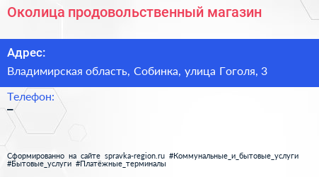 Околица, продовольственный магазин по адресу Владимирская область, Собинка, улица Гоголя, 3 в дальнейшем Организация, размещена в следующих категориях: