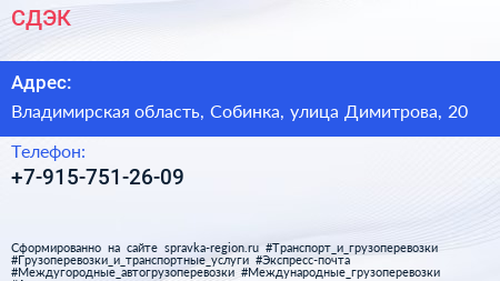 СДЭК по адресу Владимирская область, Собинка, улица Димитрова, 20 в дальнейшем Организация, размещена в следующих категориях: