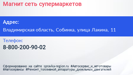 Магнит, сеть супермаркетов по адресу Владимирская область, Собинка, улица Лакина, 11 в дальнейшем Организация, размещена в следующих категориях: