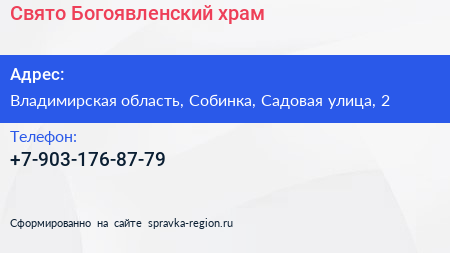 Свято-Богоявленский храм по адресу Владимирская область, Собинка, Садовая улица, 2 в дальнейшем Организация, размещена в следующих категориях:
