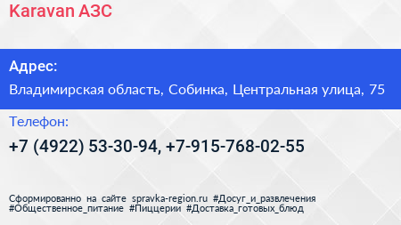 Karavan, АЗС по адресу Владимирская область, Собинка, Центральная улица, 75 в дальнейшем Организация, размещена в следующих категориях: