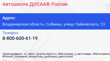 Автошкола, ДОСААФ России по адресу Владимирская область, Собинка, улица Чайковского, 13 в дальнейшем Организация, размещена в следующих категориях: