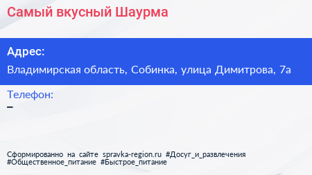 Самый вкусный Шаурма по адресу Владимирская область, Собинка, улица Димитрова, 7а в дальнейшем Организация, размещена в следующих категориях: