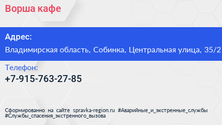 Ворша, кафе по адресу Владимирская область, Собинка, Центральная улица, 35/2 в дальнейшем Организация, размещена в следующих категориях: