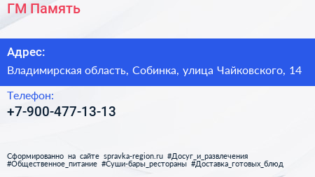ГМ Память по адресу Владимирская область, Собинка, улица Чайковского, 14 в дальнейшем Организация, размещена в следующих категориях: