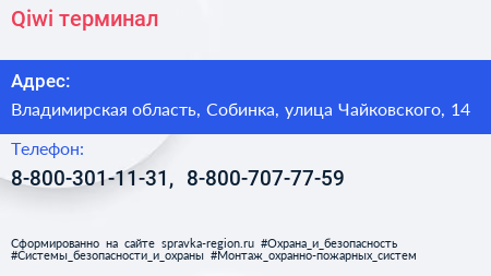 Qiwi, терминал по адресу Владимирская область, Собинка, улица Чайковского, 14 в дальнейшем Организация, размещена в следующих категориях:
