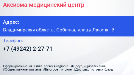 Аксиома, медицинский центр по адресу Владимирская область, Собинка, улица Лакина, 9 в дальнейшем Организация, размещена в следующих категориях: