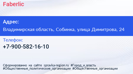 Faberlic по адресу Владимирская область, Собинка, улица Димитрова, 24 в дальнейшем Организация, размещена в следующих категориях: