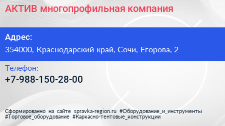 АКТИВ, многопрофильная компания по адресу 354000, Краснодарский край, Сочи, Егорова, 2 в дальнейшем Организация, размещена в следующих категориях: