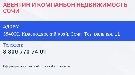 АВЕНТИН И КОМПАНЬОН. НЕДВИЖИМОСТЬ СОЧИ по адресу 354000, Краснодарский край, Сочи, Театральная, 11 в дальнейшем Организация, размещена в следующих категориях: