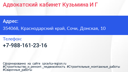 Адвокатский кабинет Кузьмина И.Г. по адресу 354068, Краснодарский край, Сочи, Донская, 10 в дальнейшем Организация, размещена в следующих категориях: