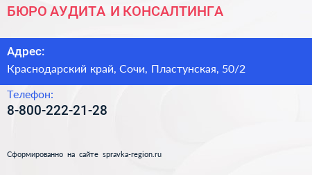 БЮРО АУДИТА И КОНСАЛТИНГА по адресу Краснодарский край, Сочи, Пластунская, 50/2 в дальнейшем Организация, размещена в следующих категориях: