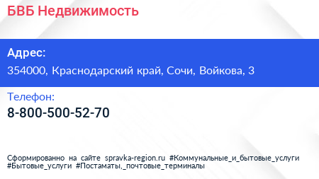 БВБ Недвижимость по адресу 354000, Краснодарский край, Сочи, Войкова, 3 в дальнейшем Организация, размещена в следующих категориях: