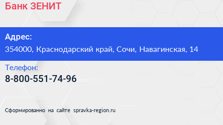Банк ЗЕНИТ по адресу 354000, Краснодарский край, Сочи, Навагинская, 14 в дальнейшем Организация, размещена в следующих категориях: