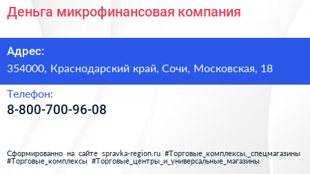 Деньга, микрофинансовая компания по адресу 354000, Краснодарский край, Сочи, Московская, 18 в дальнейшем Организация, размещена в следующих категориях: