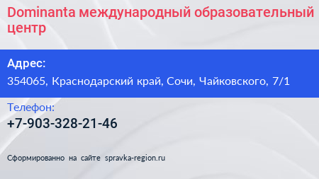 Dominanta, международный образовательный центр по адресу 354065, Краснодарский край, Сочи, Чайковского, 7/1 в дальнейшем Организация, размещена в следующих категориях: