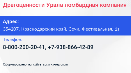 Драгоценности Урала, ломбардная компания по адресу 354207, Краснодарский край, Сочи, Фестивальная, 1а в дальнейшем Организация, размещена в следующих категориях: