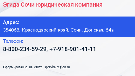 Эгида-Сочи, юридическая компания по адресу 354068, Краснодарский край, Сочи, Донская, 54а в дальнейшем Организация, размещена в следующих категориях: