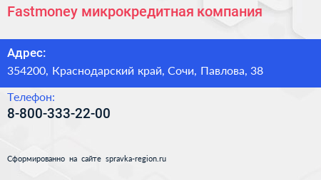 Fastmoney, микрокредитная компания по адресу 354200, Краснодарский край, Сочи, Павлова, 38 в дальнейшем Организация, размещена в следующих категориях: