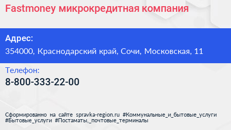 Fastmoney, микрокредитная компания по адресу 354000, Краснодарский край, Сочи, Московская, 11 в дальнейшем Организация, размещена в следующих категориях: