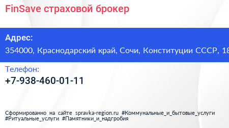 FinSave, страховой брокер по адресу 354000, Краснодарский край, Сочи, Конституции СССР, 18 в дальнейшем Организация, размещена в следующих категориях: