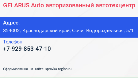 GELARUS Auto, авторизованный автотехцентр по адресу 354002, Краснодарский край, Сочи, Водораздельная, 5/1 в дальнейшем Организация, размещена в следующих категориях: