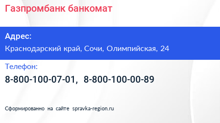 Газпромбанк, банкомат по адресу Краснодарский край, Сочи, Олимпийская, 24 в дальнейшем Организация, размещена в следующих категориях: