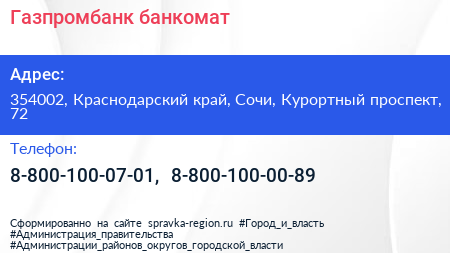 Газпромбанк, банкомат по адресу 354002, Краснодарский край, Сочи, Курортный проспект, 72 в дальнейшем Организация, размещена в следующих категориях: