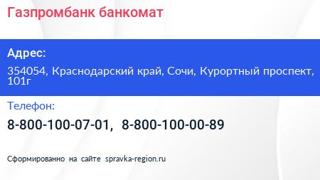 Газпромбанк, банкомат по адресу 354054, Краснодарский край, Сочи, Курортный проспект, 101г в дальнейшем Организация, размещена в следующих категориях: