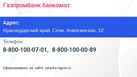 Газпромбанк, банкомат по адресу Краснодарский край, Сочи, Ачипсинская, 12 в дальнейшем Организация, размещена в следующих категориях: