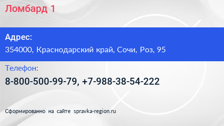 Ломбард №1 по адресу 354000, Краснодарский край, Сочи, Роз, 95 в дальнейшем Организация, размещена в следующих категориях: