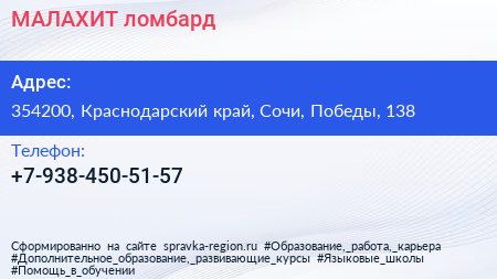 МАЛАХИТ, ломбард по адресу 354200, Краснодарский край, Сочи, Победы, 138 в дальнейшем Организация, размещена в следующих категориях: