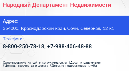 Народный Департамент Недвижимости по адресу 354000, Краснодарский край, Сочи, Северная, 12 к1 в дальнейшем Организация, размещена в следующих категориях: