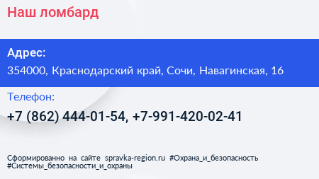 Наш ломбард по адресу 354000, Краснодарский край, Сочи, Навагинская, 16 в дальнейшем Организация, размещена в следующих категориях: