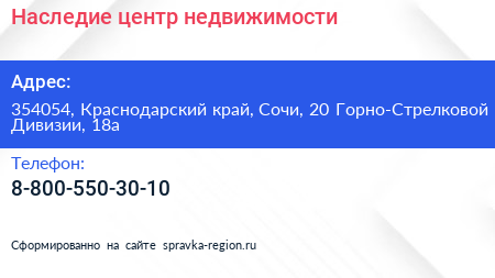 Наследие, центр недвижимости по адресу 354054, Краснодарский край, Сочи, 20 Горно-Стрелковой Дивизии, 18а в дальнейшем Организация, размещена в следующих категориях: