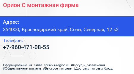 Орион-С, монтажная фирма по адресу 354000, Краснодарский край, Сочи, Северная, 12 к2 в дальнейшем Организация, размещена в следующих категориях: