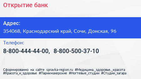 Открытие, банк по адресу 354068, Краснодарский край, Сочи, Донская, 96 в дальнейшем Организация, размещена в следующих категориях: