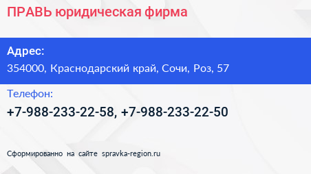 ПРАВЬ, юридическая фирма по адресу 354000, Краснодарский край, Сочи, Роз, 57 в дальнейшем Организация, размещена в следующих категориях: