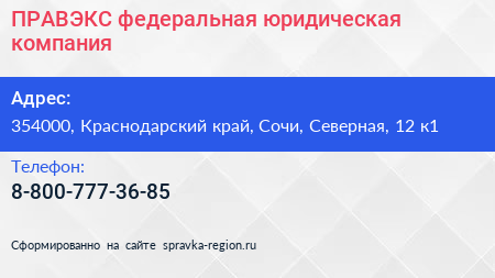 ПРАВЭКС, федеральная юридическая компания по адресу 354000, Краснодарский край, Сочи, Северная, 12 к1 в дальнейшем Организация, размещена в следующих категориях: