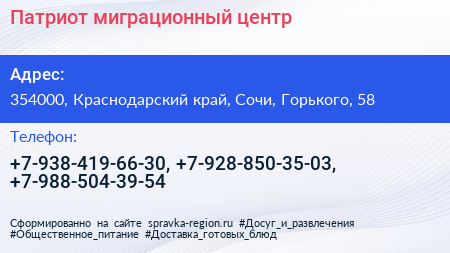 Патриот, миграционный центр по адресу 354000, Краснодарский край, Сочи, Горького, 58 в дальнейшем Организация, размещена в следующих категориях: