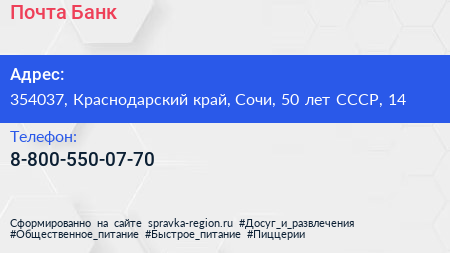 Почта Банк по адресу 354037, Краснодарский край, Сочи, 50 лет СССР, 14 в дальнейшем Организация, размещена в следующих категориях: