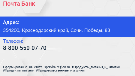 Почта Банк по адресу 354200, Краснодарский край, Сочи, Победы, 83 в дальнейшем Организация, размещена в следующих категориях: