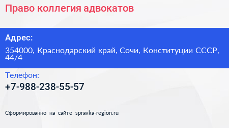 Право, коллегия адвокатов по адресу 354000, Краснодарский край, Сочи, Конституции СССР, 44/4 в дальнейшем Организация, размещена в следующих категориях: